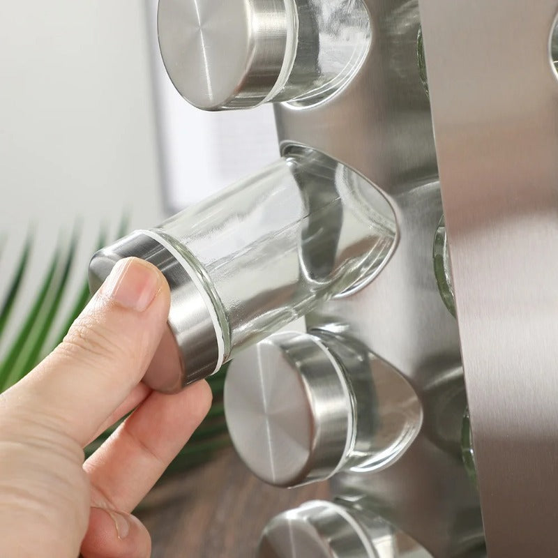 Schauen Sie sich bitte dieses Drehgestell für Gewürzflaschen aus Glas an. Dieses Gewürzregal und die Flasche können Ihnen dabei helfen, eine Vielzahl von Gewürzen aufzubewahren und Ihre Küche aufgeräumter und schöner zu machen.